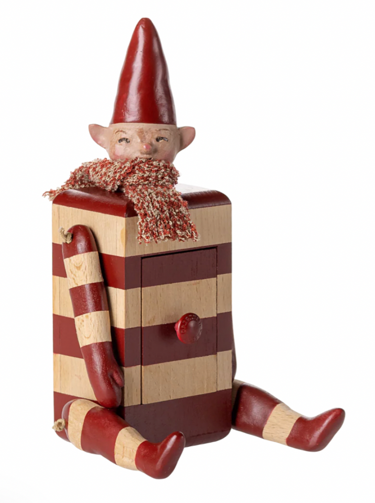 A Maileg Collectible - This beautiful decoration item is a true classic that has been redefined with new details that gives the product a unique expression. Open the small drawer and hide small gifts or treats. Each figure is packed in a gift box.